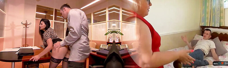 Sexy MILF Stepmom Sucks Cock While Son Gets Blowjob From Busty Friend