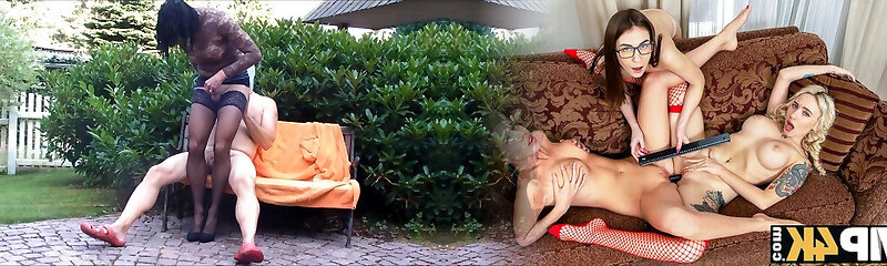Public Porno Show: Fucking in the Garden Black Stockings Blowjob
