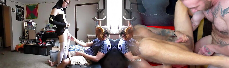 Crossdresser Horny Fucks Homemade Tits, Gets Blowjob by Bisexual Group Sex