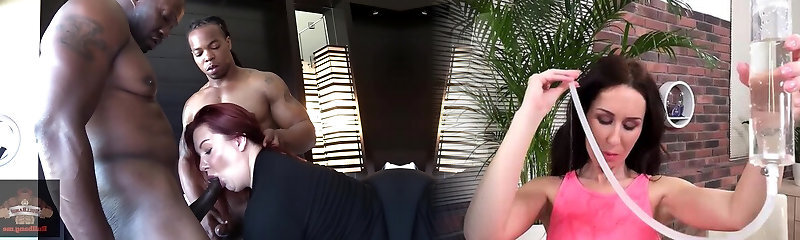Titillating Brunette Gobbles Down Two Monster Penises