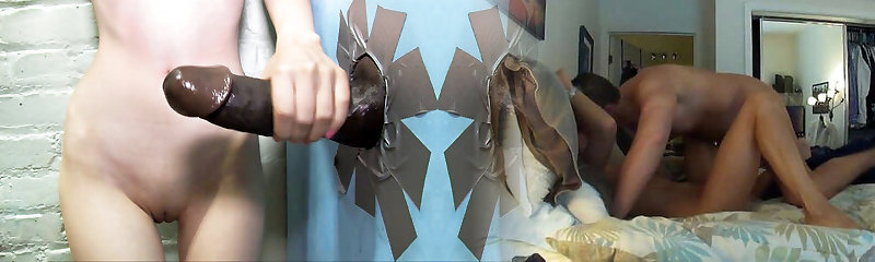 Round Natural Tits Take On Two Black Cocks in a Gloryhole Handjob